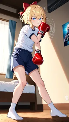2girls,anime style,young girls,small children,indoor room scene,sitting on floor,touching boxing gloves curiously,playful atmosphere,first girl,blond hair,short hair,bob hair,(hair bow:1.4),(red bow:1.4),blue eyes,sparkling eyes,curious expression,small body,petite frame,pink t-shirt,white shorts,bare feet,reaching hand toward glove,second girl,black hair,short hair,straight hair,dark eyes,excited smile,cheerful face,small stature,yellow dress,short sleeves,white socks,both girls kneeling,leaning forward,hands touching red boxing gloves,gloves placed on wooden floor,children's room interior,toy box in corner,colorful rug beneath them,stuffed animals on shelf,pastel colored walls,soft lighting from window,afternoon sunlight,cozy atmosphere,domestic setting,playful poses,full body visible,from slightly above angle,detailed hand gestures,patting motion,gentle touching,innocent scene,warm interior lighting,homey environment,(masterpiece:1.4),(best quality:1.4),(very aesthetic:1.3),(absurdres:1.3),