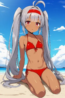 黄金の髪をツインテールに結び、赤い瞳を輝かせたエルフの少女が、青い海辺に座る。橙色のビキニが陽光に映え、波の音が彼女の心をくすぐる。森の民として初めて訪れたビーチで、貝殻を探す小さな冒険が始まる。潮風に吹かれながら、遠くの山々を眺め、未知の世界への好奇心が膨らむ。彼女の笑顔が、夏の物語を紡ぎ出す瞬間。 (タイトル・キャプション自動生成)