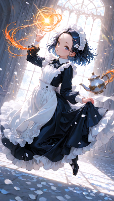 古い洋館の窓辺で、青いドレスをまとったメイドの少女が紅茶を注ぐ。陽光が部屋を優しく照らし、彼女の日常に穏やかな瞬間が訪れる。ポットから立ち上る湯気は、遠い記憶を呼び起こすよう。もしかすると、この紅茶には主人の知らない魔法が込められているのかもしれない。彼女の瞳に映るのは、冒険の予感か、それとも静かな秘密か。読む者の心を優しく包む、幻想的なひと時。