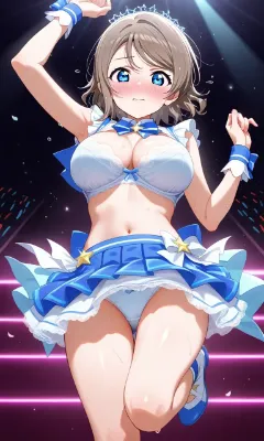 「みんな、ヨーソロー!一緒に飛び跳ねよう!」と明るく笑顔でジャンプする青いフリル衣装の少女。スポットライトを浴びて、活発な魅力が溢れ出すステージでの一幕。