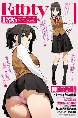 masterpiece,best quality,extremely detailed,JK Magazine Cover and Title,(text japanese:1.3),Fate/stay night,1 high school girl,various cute hairstyle,homurahara_academy_uniform,skirt,girl's cute panties,socks,loafers,Seductive_expression,pantyshot,cowboy_shot,crotch_focus,erotic_angle,multiple_views,