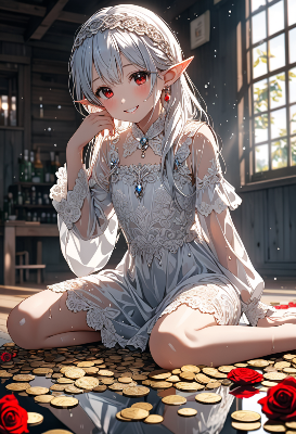 古い館の部屋で、エルフの姫は金貨の海に優雅に座り、窓から差し込む柔らかな光に照らされている。白いバラが周りを彩り、彼女の赤い瞳が秘密の物語を語る。幼い頃の宝探しの記憶が蘇り、新たな冒険への扉が開こうとしている。静かな部屋に浮かぶ泡のような雪が、幻想的な瞬間を演出する。