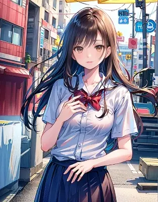 (realistic, photo-realistic:1.37), (masterpiece), (best quality:1.4), (ultra high res:1.2),(RAW photo:1.2), (sharp focus:1.3), (Beautiful entertainment street:1.2),best quality, masterpiece,1 girl, white skin,brown eyes,spoiled girl,beautiful girl,(tidy young lady:1.3),(black long hair),flat chest,17 years old,cowboy shot,breast focus,(school uniform:1.2)