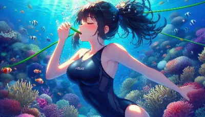 Detailed anime-style image of a girl of Asian descent unable to hold her breath while swimming at the bottom of the Coral Sea. She is wearing a sleek competitive sleeveless dark blue swimsuit and has short, flowing black hair with high ponytail. She appears to be exhaling or struggling underwater, with many bubbles escaping from her mouth. The underwater scene is filled with vibrant light patterns from the sun, colorful fish. She closes eyes. She is caught by pink net.