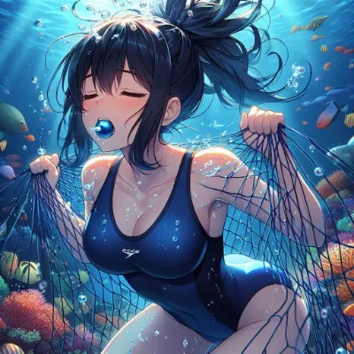 Detailed anime-style image of a girl of Asian descent unable to hold her breath while swimming at the bottom of the Coral Sea. She is wearing a sleek competitive sleevelesssilver swimsuit and has short, flowing black hair with high ponytail. She appears to be exhaling or struggling underwater, with many bubbles escaping from her mouth. The underwater scene is filled with vibrant light patterns from the sun, colorful fish. She closes eyes.Her hands tied up by pink ribbon.
