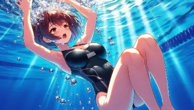 Detailed anime-style image of a girl of Asian descent unable to hold her breath while swimming at the bottom of the Coral Sea. She is wearing a sleek competitive sleeveless dark blue swimsuit and has short, flowing black hair with high ponytail. She appears to be exhaling or struggling underwater, with many bubbles escaping from her mouth. The underwater scene is filled with vibrant light patterns from the sun, colorful fish. She closes eyes. She is caught by white net.