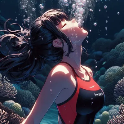 Create a detailed anime-style image of a girl swimming in a coral reef in night. She should have a gentle and relaxed expression, with her high ponytail hair flowing around her in the water. The two-piece swimsuit should have a metallic, blue sheen, with realistic light reflections that suggest movement and depth. The underwater view should show a clear blue pool. Her legs are wraped by giant clam. Best Quality.