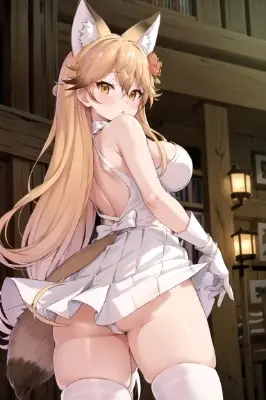 nsfw, (((masterpiece))), (((best quality))), ((ultra-detailed)), ((illustration)),((disheveled hair)), beautiful, beautiful detailed glow, beautiful detailed eyes, absurdres, incredibly absurdres, highres,16k, from behind, from below, blush, 1girl, KITAKITSU_dress,ezo red fox (kemono friends), animal ears, tail, long hair, fox ears, fox tail, hair between eyes, multicolored hair, blonde hair, white hair, gradient hair, yellow eyes, extra ears, blaidhair ornament, hair flower, dress, flower, bare shoulders, necklace, jewelry, braid, yellow gloves, short sleeves, collarbone, white gloves<lora:EzoredfoxKemonofriends_Kitakitsune:0.7>