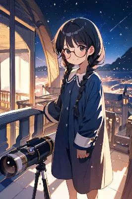 masterpiece,best quality,extremely detailed,A girl standing with several female friends of the same age who look completely different from her,child,9 years old,infant body type,flat chest,blonde hair,wavy hair,long hair,aqua eyes,thick eyebrows,forehead,cute autumn clothing,socks,shoes,standing,smile,chatting,telescope,starry_sky,night_sky,