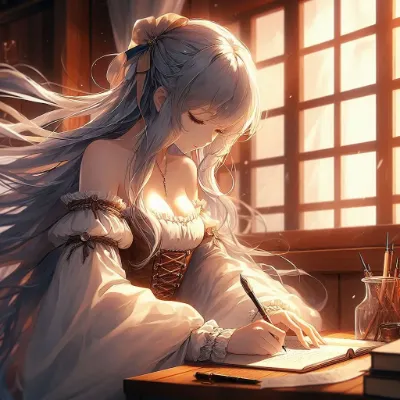 古い屋敷の書斎で、銀色の長い髪をなびかせた姫が、優しい陽光に照らされながらペンを走らせる。彼女は幼き日の失われた記憶を綴り、遠い恋人の影を追い求める。窓から差し込む光がページを黄金に染め、静かな部屋に物語の息吹が満ちる。やがて、彼女の筆が新たな冒険の扉を開く瞬間が訪れるのかもしれない。