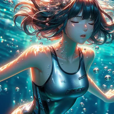 Anime detailed illustration: Set against the expansive blue of the coral ocean, a girl with a high ponytail is swimming. Her simple violet bikini, adorned with a floral pattern and frills. Air bubbles and the dance of light refractions enrich the scene. She displays a joyful and determined expression.Best Quality.