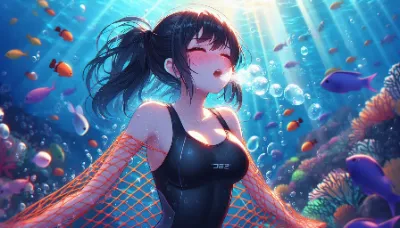 Anime-style image of a girl descent at the bottom of a deep pool, struggling to hold her breath, with her eyes closed. She is wearing a sleek competive sleeveless swimsuit, has short hair, and is sinking headfirst, completely upside down. Few bubbles are escaping from her mouth, indicating she is exhaling or struggling. The underwater scene is vibrant, illuminated by light patterns from the sun, with colorful fish and aquatic plants surrounding her. Best Quality.