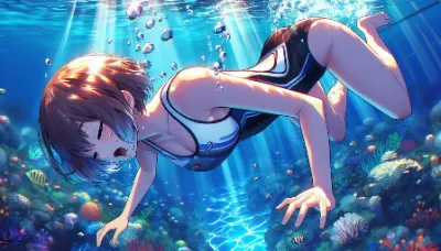 Detailed anime-style image of a girl of Asian descent unable to hold her breath while swimming at the bottom of the Coral Sea. She is wearing a sleek competitive sleeveless dark blue swimsuit and has short, flowing black hair with high ponytail. She appears to be exhaling or struggling underwater, with many bubbles escaping from her mouth. The underwater scene is filled with vibrant light patterns from the sun, colorful fish. She closes eyes. Her body caughts by pink net.