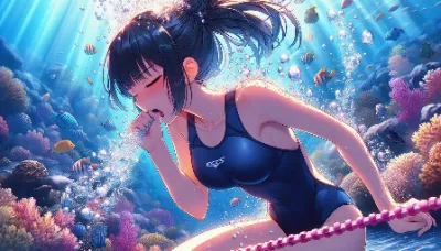 Detailed anime-style image of a girl of Asian descent unable to hold her breath while swimming at the bottom of the Coral Sea. She is wearing a sleek competitive sleeveless black swimsuit and has short, flowing black hair with high ponytail. She appears to be exhaling or struggling underwater, with many bubbles escaping from her mouth. The underwater scene is filled with vibrant light patterns from the sun, colorful fish. She closes eyes. She is caught by orange net.