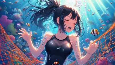 Anime detailed illustration: Set against the expansive blue of the coral ocean, a girl with a high ponytail is swimming. Her simple violet bikini, adorned with a floral pattern and frills. Air bubbles and the dance of light refractions enrich the scene. She displays a joyful and determined expression.Best Quality.
