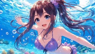 Anime detailed illustration: Set against the expansive blue of the coral ocean, a girl with a high ponytail is swimming. Her simple violet bikini, adorned with a floral pattern and frills. Air bubbles and the dance of light refractions enrich the scene. She displays a joyful and determined expression.Best Quality.