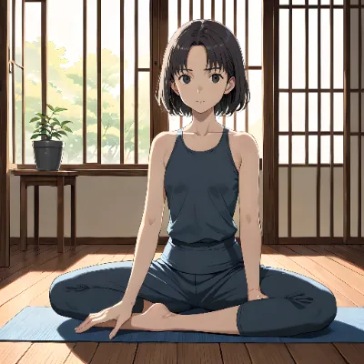 流れる力 ― 藤原あやめのヨガセッション 渡辺葵ちゃんの従姉・藤原あやめ(21歳、黒髪のお団子頭、黒い瞳、ダンサーとして鍛え上げられたしなやかな体型の女性)が、トレーニングの一環としてヨガを行っているシーン。引き締まった筋肉と長い手足が美しく伸び、彼女の動きには力強さと優雅さが共存している。衣装はスポーティーで機能的なヨガウェア(ダークグリーンのスポーツブラとブラックのハイウエストレギンス)で、鍛えられた腹筋が自然に見えるデザイン。スタジオの木床に朝日が差し込み、彼女のポーズを美しく照らしている。アニメ風の繊細なタッチで、力と静けさが調和する一瞬を描く構図。