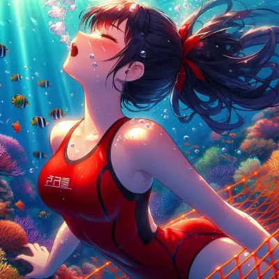 Anime detailed illustration: Set against the expansive blue of the coral ocean, a girl with a high ponytail is swimming. Her simple gold bikini, adorned with a floral pattern and frills. Air bubbles and the dance of light refractions enrich the scene. She displays a joyful and determined expression.Best Quality. Bing Image Creator
