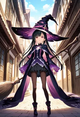 日本語で生成 生成内容(日本語):魔法の箒に跨る魔女 masterpiece, ultra-detailed, high quality, 4k resolution, 8k rendering, a witch riding a magical broom, female witch, dark fantasy style, flowing black robe, pointed witch hat, mystical atmosphere, glowing magic aura around broom, detailed facial features, intense expression, dynamic pose, mid-flight in the sky, cloudy night background, full moon, eerie lighting, intricate broom design, realistic textures, cinematic composition Negative prompt:nsfw, nude, negativeXL_D,EasyNegative,Mayng,bad-hands-5,badhandv4,text,watermark, Steps:20, Size:832x1216, Seed:1099251444, Model:meltis_vpredV1.safetensors [436292a55c], Sampler:DPM++ 2M Karras, CFG scale:7 生成日時 2025年10月20日 20時41分