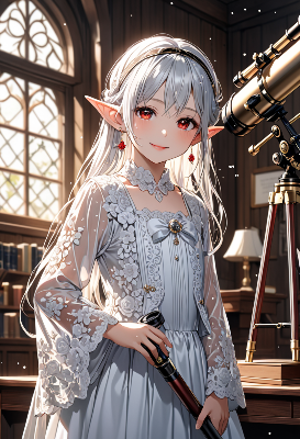 古い図書館の片隅で、白髪のエルフ少女が望遠鏡を覗き込む。窓から差し込む柔らかな光に包まれ、浮かぶ泡のような魔法の粒子が彼女の周りを舞う。彼女は失われた星の伝説を追い、夜空の向こうに広がる冒険を夢見る。果たして、望遠鏡の先に待つのはどんな神秘的な世界か? 少女の好奇心が、新たな物語を紡ぎ出す瞬間。