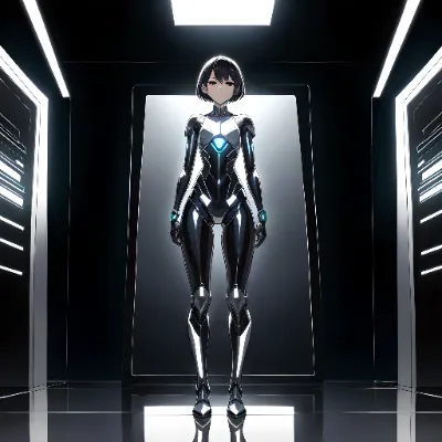 鋼のボーイッシュ ― 無垢なる中性サイボーグ 長身で筋肉質、胸が平らなボーイッシュな女子生徒が、サイボーグとして再構築される。中性的な体型とメカニカルなデザインが融合し、強さと儚さを併せ持つ姿へ。シルバーグレーのボディスーツには黒いメカラインが走り、関節部には淡い青の発光素子。瞳は冷静ながらもどこか人間味を残している。背景は光が交錯する近未来の学校構内。構図は斜め後ろからの全身ショットで、力強いポーズを取る。
