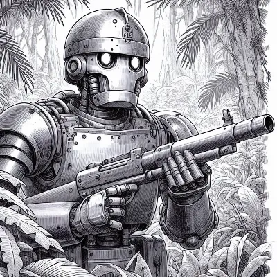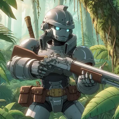 深いジャングルに潜むサイボーグの少女。彼女は失われた文明の守護者として、侵入者を狙う。風に揺れる長い髪が機械の体に溶け込み、冷徹な視線がスコープ越しに敵を捉える。かつて人間だった彼女の過去が、葉ずれの音に蘇る。果たしてこの一撃が、平和をもたらすのか、それとも新たな戦いの始まりか。想像を掻き立てる、未来の冒険譚。