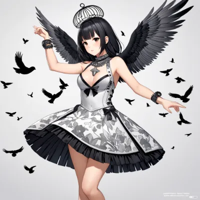 霧に包まれた古い劇場で、黒いドレスを纏った少女が目を覚ます。彼女の肩に止まる白黒の鳥たちが、囁くように歌い始める。少女は優雅に腕を広げ、鳥たちを導きながら舞う。これは、失われた魔法の森からやってきた鳥使いの少女の冒険の始まり。白いチュチュが風を切り、幻想的な光が周りを照らす中、彼女は自由への翼を広げていく。読み手は、彼女の次の旅を想像せずにはいられない。 「私の翼たちよ、共に空を舞いましょう」と優雅に微笑みながら囁く彼女。黒いコルセットドレスに白いチュチュを纏い、鳥たちを従えて幻想的なポーズを決める、クールで魅力的なバレリーナの姿。
