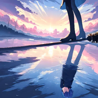 朝焼けの空、ボブ子ちゃんは柔らかな雲の上をすり抜けるように飛ぶ。頬を撫でる風、光に染まる髪。新しい一日を迎えるたび、彼女は少しずつ魔法に慣れていくのだった。