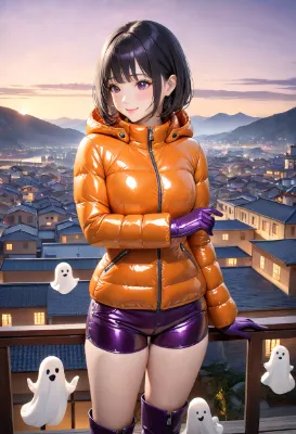 (photorealistic:1.4), (RAW photo), masterpiece, best quality, extremely detailed, lady, maid, neat and clean, elegant, polite, (shy:0.9), black long ponytail hair, almond eyes, (smile:0.9), white brim, slim fit, high necked, closed zipper, (shiny black short puffer down jacket:1.3), patent leather corset, (white leather long gloves, (ruffled mini apron skirt, (platform lace-up long boots))), BREAK, (blue-purple phosphorescent, holding bamboo broom), (high angle shot:0.6), (dark room, closed curtains, old creepy mansion), candle, cobweb