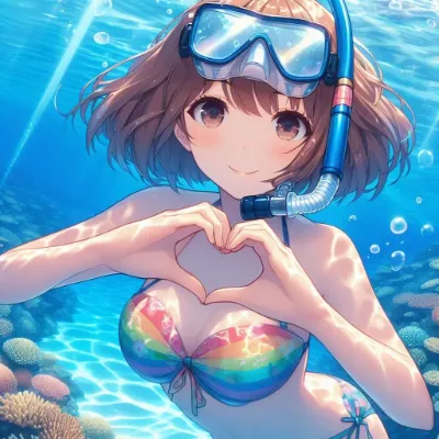 Create an anime-style image of a girl swimming in a coral reef, making a heart symbol with her hands. She should have a gentle and relaxed expression, with her high ponytail hair flowing around her in the water. The two-piece swimsuit should have a neon rainbow, floral pattern, with realistic light reflections that suggest movement and depth. The underwater view should show a clear blue pool with light patterns reflected on the bottom of coral reef. Best Quality.