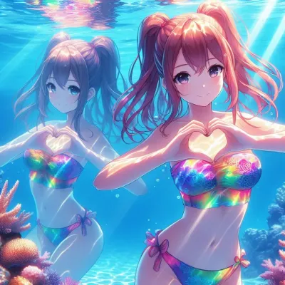 Create a detailed anime-style image of a girl swimming in a coral reef in night. She should have a gentle and relaxed expression, with her high ponytail hair flowing around her in the water. The two-piece swimsuit should have a metallic, blue sheen, with realistic light reflections that suggest movement and depth. The underwater view should show a clear blue pool. Her legs are wraped by giant clam. Best Quality.