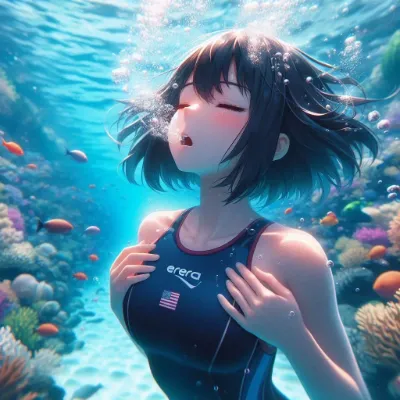 Anime-style image of a girl descent on the bottom of a deep pool, struggling to hold her breath, with her eyes closed. She is wearing a sleek competive sleeveless dark violet swimsuit, has long hair, and is sinking headfirst, completely upside down. Many air bubbles are escaping from her mouth, indicating she is struggling. The underwater scene is vibrant, illuminated by light patterns from the sun.Best Quality.