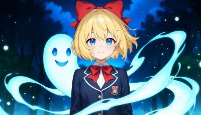 2girls,outdoors,abandoned ruins,walking through ruins,(hair bow:1.4),(red bow:1.4),blonde girl with short hair,bob hair,blue eyes,black hair girl with short hair,blond hair,short hair,bob hair,blue eyes,black hair,short hair,surprised expression,slightly scared face,medium breasts,casual explorer clothes,dark colored jacket,jeans,sneakers,backpack,holding flashlight,standing close together,walking pose,cautious posture,crumbling stone walls,broken windows,overgrown vines,cracked floor,scattered debris,dusty atmosphere,(multiple ghosts:1.3),(transparent spirits:1.3),floating around girls,reaching toward them,eerie glowing eyes,misty apparitions,foggy environment,dim moonlight through broken ceiling,dramatic shadows,mysterious blue glow,full body shot,dynamic composition,tense atmosphere,spooky mood,(masterpiece:1.3),(best quality:1.3),(very aesthetic:1.2),(absurdres:1.2),