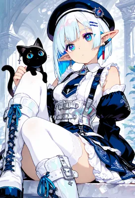 壮大な城のバルコニーで、青い髪のエルフ姫が虹のように輝くドレスを纏い、優雅に佇む。傍らには忠実な黒猫が寄り添い、秘密の冒険を囁きかけるよう。彼女は王国の守護者として、魔法の力で平和を保ってきたが、今日、予期せぬ来訪者が訪れる予感がする。風に揺れる裾が、未知の物語を予感させる瞬間。あなたはどんな結末を想像するだろうか?