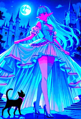 古い城の回廊で、青い瞳のエルフ少女が黒猫を抱きながら座っている。彼女は軍服風の衣装をまとい、冒険の合間に訪れたこの静かな場所で休息を取る。猫の柔らかな毛並みに頰を寄せ、遠くの戦いを思い浮かべる。もしかすると、この猫は彼女の忠実な仲間で、魔法の力を持つのかもしれない。穏やかな光が差し込む中、二人は次の冒険への力を蓄える瞬間を共有する。