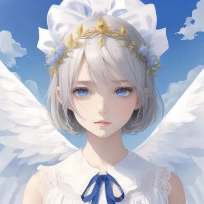 <lora:flat2:0..1>,1 girl,(Watercolor),Mysterious,masterpiece,Highest quality,adult female,looks sleepy,Golden ratio,upper body,(around 30 years old),thin lips,hollow eyes,ajar mouth,((gray eyes)),blonde hair,short hair,(blue flower headdress),(angel wings),white wings,((White dress with a blue ribbon on the chest)),a heavenly place,(heaven),floating soap bubbles,blue sky,White cloud