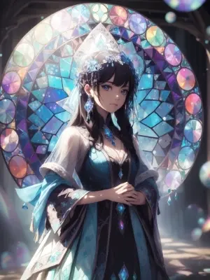 (blurry background:1.3), (extremely detailed fine touch:1.3), (hard light, studio light, light rays, dappled light, reflection, shadows, ray tracing:1.0), ///, girl, mandala, stained glass, mosaic, snowflake, crystal, gemstone, rainbow, bubbles