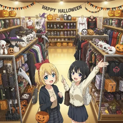 2girls,anime style,(halloween theme:1.2),first girl with blond hair,short hair,bob hair,blue eyes,almond eyes,happy expression,small breasts,wearing witch hat with orange ribbon,black dress with pumpkin patterns,long sleeves,holding candy basket in right hand,standing with legs slightly apart,head tilted to side,arms outstretched for treats,toes pointed inward,second girl with black hair,short hair,brown eyes,round eyes,excited expression,small breasts,wearing ghost costume with white sheet and black eyes,holding pumpkin lantern in left hand,standing beside first girl with one foot forward,head turned to viewer,arms raised in cheer,knees bent slightly,toes curled in excitement,at front door entrance,detailed wooden door with halloween decorations,jack-o-lanterns on steps,autumn leaves scattered,night sky with full moon,cobwebs on porch,candy wrappers flying,breeze,(hair bow:1.4),red bow,(masterpiece:1.2),(best quality:1.2),(very aesthetic:1.1),(absurdres:1.1),