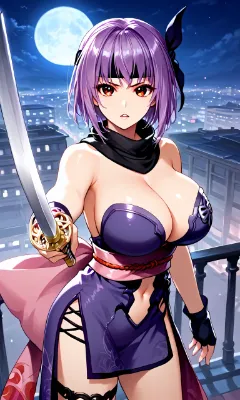 doaayane, purple hair, short medium hair, crimson eyes, headband behind bangs, <lora:doaayane-pdxl-nvwls-v1:0.6>, succubus costume, purple bikini, micro bikini, rubber clothes, shiny clothes, bat wings, womb tattoo, pubic tattoo, glowing tattoo, detached sleeves, purple thigh highs, sensual, sensuous, open mouth, out tongue, licking finger, night, red moon, full moon, outdoor, in resort area,