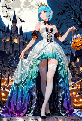 満月の輝くハロウィンの夜、青い髪のエルフ少女が古い城の影で微笑む。かぼちゃの山に腰掛け、手を振る彼女の背後には小さな仲間がキャンディを抱えて忍び寄る。彼女たちは街を駆け巡り、甘いお菓子と小さな魔法で人々を驚かせる冒険を繰り広げる。月の光が照らす中、どんないたずらが待っているのか? 想像力を刺激する不思議な一夜の物語。
