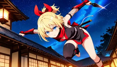 2girls,(hair bow, red bow:1.4),blond hair,short hair,bob hair,blue eyes,small girl,cheerful expression,black hair,short hair,brown eyes,smiling face,both wearing kunoichi costumes,ninja-style outfit,scarves fluttering,headbands,small breast,youthful body,crouching pose,playful stance,one girl making a hand sign,the other jumping lightly,park background,green grass,trees,sunshine filtering through leaves,fallen leaves on ground,(wind:1.3),sense of movement,joyful and energetic atmosphere,(anime style:1.2),(masterpiece:1.3),(best quality:1.2),(very aesthetic:1.2),(absurdres:1.2),