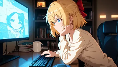 1girl,solo,outdoors,autumn grassland,standing still,watching cow,(hair bow:1.4),(red bow:1.4),blond hair,short hair,bob hair,blue eyes,detailed eyes,vacant expression,daydreaming face,slightly open mouth,medium breasts,long sleeve casual outfit,beige knit sweater,denim jeans,brown boots,hands in pockets,relaxed standing pose,weight on one leg,full body visible,feet firmly on ground,(running cow:1.3),brown cow in distance,cow running across field,wide open grassland,autumn meadow,golden dry grass,fallen leaves scattered,gentle rolling hills,clear blue sky,white clouds,distant trees with autumn colors,orange and yellow foliage,peaceful countryside,(tranquil atmosphere:1.2),soft afternoon sunlight,warm lighting,gentle breeze,grass swaying,serene mood,rural landscape,(masterpiece:1.3),(best quality:1.3),(very aesthetic:1.2),(absurdres:1.2),
