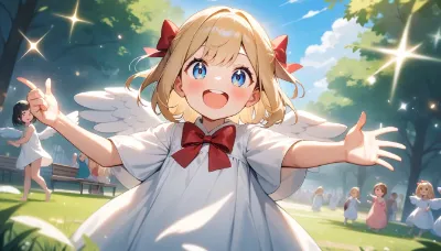 1girl,solo,outdoors,city street,walking,(hair bow:1.5),(red bow:1.5),blond hair,short hair,bob hair,blue eyes,detailed eyes,amazed expression,impressed face,wide eyes,slight smile,medium breasts,casual outfit,white blouse,light cardigan,denim skirt,comfortable shoes,standing pose,one hand slightly raised,looking forward with admiration,full body visible,feet on sidewalk,(angel costumed girl in front:1.4),girl in white angel costume ahead,large white feathered wings,white flowing dress,halo accessory,walking away from viewer,urban street scene,city buildings,shop windows,pedestrian crosswalk,traffic signs,other people walking,autumn trees lining street,clear blue sky,afternoon sunlight,natural lighting,(sense of wonder:1.3),peaceful city atmosphere,modern Japanese town,clean streets,storefronts with displays,distant cars,everyday life scene,warm color palette,(masterpiece:1.3),(best quality:1.3),(very aesthetic:1.2),(absurdres:1.2),