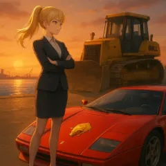 夕暮れの港。 海面が黄金に輝き、風が吹く。 ブロント少尉は赤いスーパーカーの前で腕を組み、 ボンネットに輝く黄金のエンブレムを見つめていた。 「ふむ……牛のマークか。力強さの象徴だな。」 しかし、彼女の視線はもうすでに別の方向を見ていた。 港の奥で、影がゆっくり動く。 キャタピラの唸り、金属のきしみ。 **黄色い巨大な車体ー**だ。 「……あれが本物の“ブル”か。」 そこへ現れたサングラスのチャラ男。 赤いスーパーカーの前に立つ美人に、 声をかけずにはいられない。 「お姉さん、乗りたい? “ブル”にさ。」 少尉、即答。 「はい。とてもかっこいいです。」 「お、マジ? じゃ、乗っていいよ。」 「いいのか。やった~。」 チャラ男は助手席を開けようとする。 だが少尉は軽やかにその横をすり抜け、 港の奥へ一直線に歩いていった。 「え? そっち、重機置き場だけど!?」 少尉は振り返らずに言う。 「うむ、**“ブル”はあっちにいるだろう。**」 チャラ男「あ、いや俺の“ブル”はこっちの――」 次の瞬間、轟音。 ブルドーザーのエンジンが唸りを上げた。 運転席には、金髪ポニーテールの少尉。 完全にノリノリである。 「ふむ。操作性良好。視界も広い。実に機能的だ!」 「お、おい! まさか――」 「――出るぞ、“ブル”!」 ブルドーザーが咆哮し、港を疾走! 潮風と埃の中、チャラ男の悲鳴がこだまする。 「待ってええええ!!」 遠ざかる轟音とともに、 夕陽の中で少尉の声が聞こえた。 「やはり、牡牛は動ける土の上の方がいいな!」