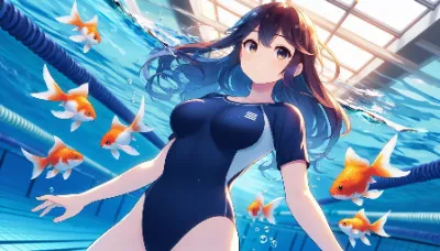 Detailed anime-style image of a girl of Asian descent unable to hold her breath while sinking at the bottom of a coral reef. She wears a sleek competitive sleeveless dark blue swimsuit, a diving mask, a snorkel, and fins and has flowing hair with high ponytail. She appears to be exhaling or struggling underwater, with many bubbles escaping from her mouth. The underwater scene is filled with vibrant light patterns from the sun, colorful fish. She closes eyes. Best Quality