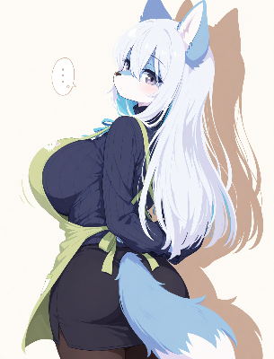 1girl, wolf girl, furry female, (snout:1.3), blue fur, wolf ears, ears up, wolf tail, body fur, fluffy fur, wolf paws, (gigantic breasts), sagging breasts, slim, wide hips, thick thighs, silver hair, hime-cut, long hair, colored inner hair, hair between eyes, hair over eyes, silver eyes, long bangs, expressionless, unemotional, light-open mouth, puff of air, revealing clothes, undersized clothes, high collar, black collar, blue neck ribbon with loose ends, layering, separated turtleneck and sweater vest, v-neck beige sweater, aran sweater, black turtleneck under sweater, long sleeves, black skirt, pencil skirt, black pantyhose, running, leaning forward, legs apart, motion lines, motion blur, motion trail, afterimage, speed lines, floating hair, from side, profile, looking ahead, blue striped background, simple background, hair shade, ((high contrast)), (digital art:1.1), (anime coloring), (kawaii), softy, (2D), (cute), furry, (two tone fur), (furry body), perfect body, detailed face, high quality, cute clothes, animal tail, animal ears, solo, masterpiece, ((correct_anatomy)), pretty and cute, comical, simple, anime, Bright colors, Contour line, pale painting, (detailed_hands:1.5), flat color, no lineart, close-up, eye focus