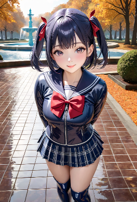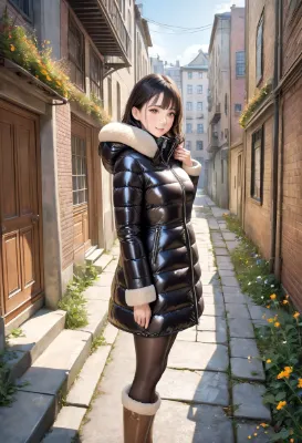 (photorealistic:1.4), (RAW photo), masterpiece, best quality, extremely detailed, madam, neat and clean, elegant, polite, (shy:0.9), black long hair, almond eyes, (smile:0.9), slim fit, high necked, closed zipper, (shiny black short puffer down coat), patent leather belt, blue denim jeans, (brown UGG long boots:1.2), chic cafe, sit on wooden chair, coffee on wooden table, (high angle shot:0.8), cobblestone, good view, winter sunny day