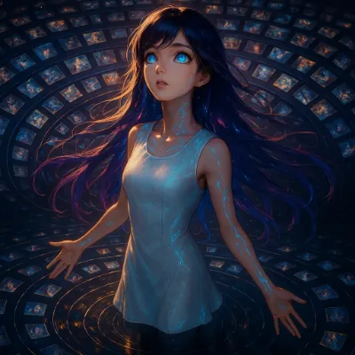 暗闇に包まれた部屋で、青い髪の少女がスマホを握りしめる。彼女の瞳にはデジタルコードが映り込み、仮想世界への扉が開く。日常の喧騒を離れ、夜の静寂の中で繰り広げられる冒険。画面の向こうに広がる無限の可能性に、心を奪われる瞬間。彼女はそこで何を見つけ、何を失うのか? 読み手の想像を掻き立てる、神秘的な一夜の物語。