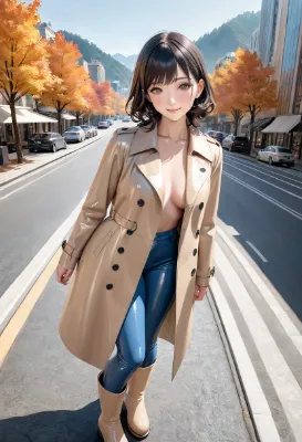 (photorealistic:1.4), (RAW photo), masterpiece, best quality, extremely detailed, wife, neat and clean, elegant, polite, (shy:0.9), black wavy medium length hair, almond eyes, (smile:0.9), slim fit, enamel, rubber, latex, leather, (light beige trench coat, black long gloves, high heeled knee high boots), standing pose, (high angle shot:0.8), stylish business district, avenue trees, buildings, good view, skyscrapers, cold autumn
