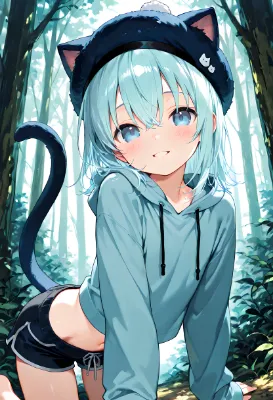 1girl, loli petite, wolf ear, wolf tail, white hair, miko, detached sleeves, miniskirt, beautiful legs, huge breasts, impposible clothes, perky breasts under shirt, in forest, (claw pose:1.2), innocent expression, smile, on all fours, from below,